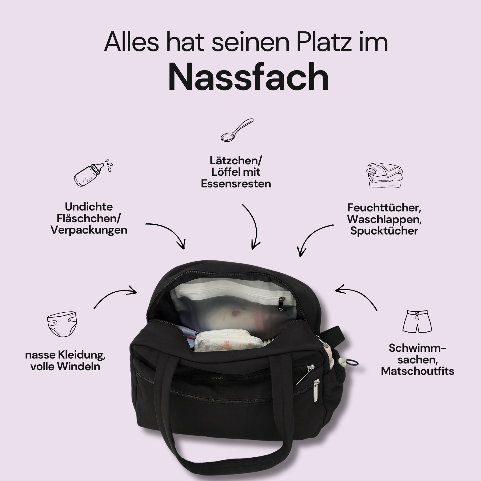 Die Tasche besteht aus wasserabweisendem Polyester. Das Nassfach ist robust, leicht zu reinigen und schützt zuverlässig vor Feuchtigkeit und Gerüchen. Ideal für den Alltag mit Kind.